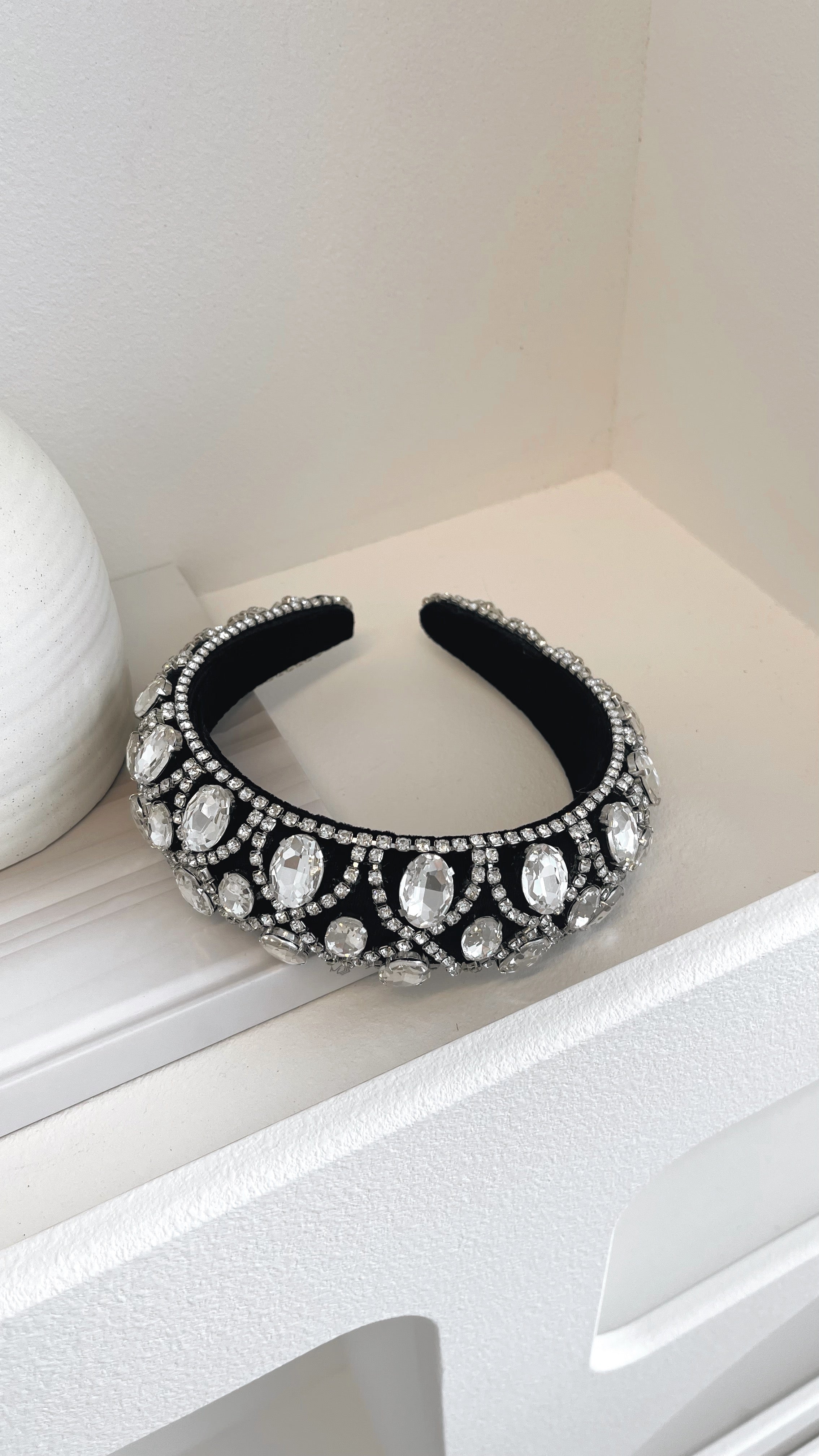 The Deka Headband is crafted with a black velvet base and faux diamantes. The wrap around beaded detailing creates a seamless look, and pairs perfectly with your racewear looks.
